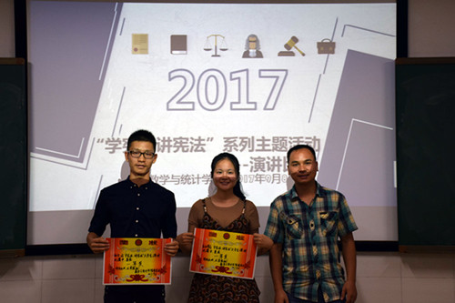 比赛初始,主持人分别介绍了到场的各位评委,紧接着参赛选手按年级次序依次上台演讲。选手旁征博引,用“国无法则乱,民无法则贫”,提出对国家建设和对法的概念,呼吁大家行动起来,遵法守法,争做国家栋梁。用一个个生动的列子阐述了自己对宪法的理解,为什么要遵守宪法,如何去遵守宪法,从身边的礼仪小事谈起,进而引申到国家平安和民族团结。他们还谈到了“校园暴力”,呼吁大家要懂法守法,这样才能保护好自己的切身利益。选手们选题新颖、联系实际、各具特色,最终来自16级数应班的贺文获得了本次演讲比赛的特等奖。