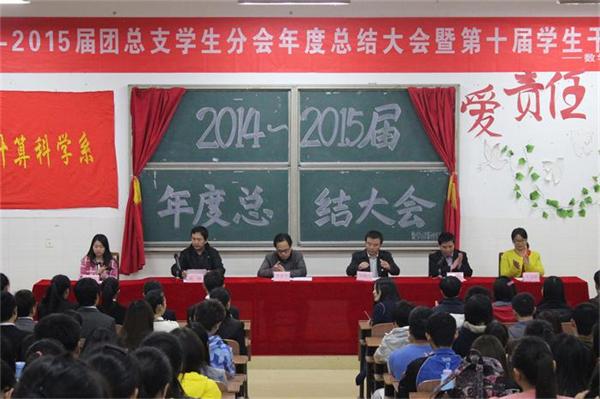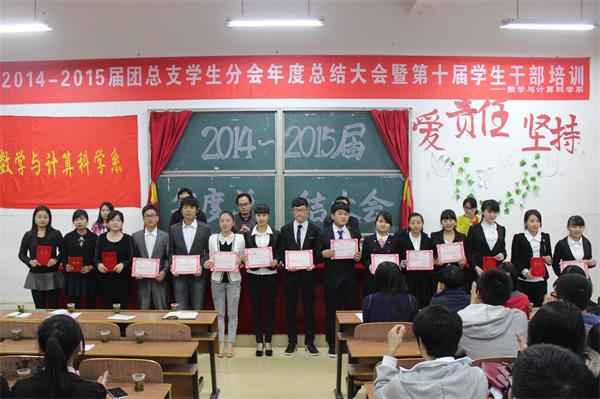 11 月18日晚,数学与计算科学系2014—2015届团总支学生分会年度总结大会暨第十届学生干部培训在数学楼505隆重举行。数学与计算科学系主任罗李平、党总支书记邹梅山、副主任杨柳、辅导员王方晖、刘琴出席大会,系团总支学生分会全体成员、学生党支部书记、各社团负责人以及各班学生干部代表参加会议。会议由党总支副书记凌剑飞主持。