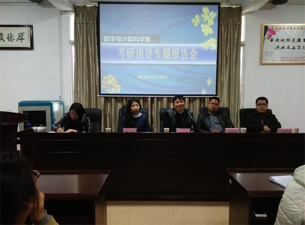 4月10日下午,数学与计算科学系2015年度考研指导专题报告会在数学楼三楼会议室举行,院实践教学科邓育武科长、就业指导中心刘高见老师、经济与管理系皮上玉老师、数学与计算科学系罗振国博士担纲主讲,2012级全体考研学生参加。