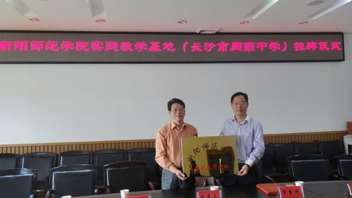 4月28日下午,我校副校长张登玉率我院负责人、教务处实践科同志等一行6人赴长沙市周南中学举行衡阳师范学院实践教学基地挂牌暨客座教授聘任仪式。长沙市周南中学党政领导等参加了授牌及聘任仪式。