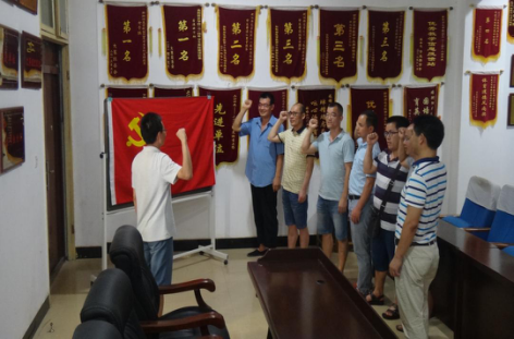 面对鲜红的党旗,教工党支部书记领誓,全体党员再一次举起右拳,重温入党誓词:“我志愿加入中国共产党,拥护党的纲领,遵守党的章程,履行党员义务,执行党的决定,严守党的纪律,保守党的秘密,对党忠诚,积极工作,为共产主义奋斗终身,随时准备为党和人民牺牲一切,永不叛党。”短短十二句入党誓词,字字千钧,既概括了我们党对党员的基本要求,也概括了党员对党组织的事业所应承担的政治责任。