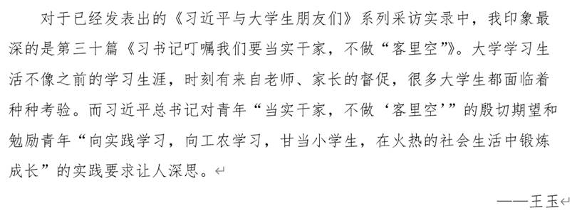 本次活动提升了学院的读书氛围,让同学们在书香中不断充实自我,正如习近平总书记勉励青年一代的那样,他们定会“坚定信仰,砥砺品德,珍惜时光,勤奋学习,努力成长为有理想、有本领、有担当的社会主义建设者和接班人,为实现中华民族伟大复兴的中国梦贡献自己的智慧和力量”。