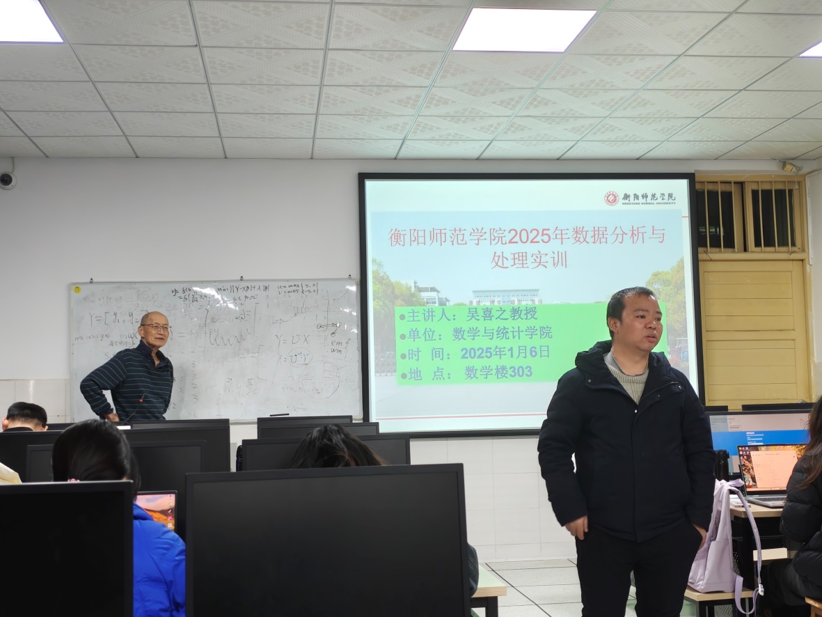 2025年1月2日,著名统计学家,数据科学先驱者之一,中国人民大学吴喜之教授在衡阳师范学院新校区理科1栋数学楼303开展《数据分析与处理实训》实践课程教学。衡阳师范学院是吴喜之教授在全国第三十所高校开展专业学分教学的高校。此次实践课程教学时间是1月2日至1月10日。麻豆人妻少妇精品无码区数学与应用数学、信息与计算科学和统计学专业教师,教育科学学院和经济管理学院部分教师和2021级和2022级数学与应用数学、信息与计算科学和统计学专业学生参加此次活动。由曹灿等专任教师担任本次实践课程助教,辅助吴教授课堂教学,分配数据任务和收集分析报告等工作。