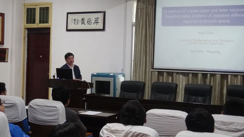 随后下午4点,在数学楼学术报告厅,中南大学博士生导师陈海波教授作了题为脉冲常微分方程边值问题—L拟上下解方法的学术报告。教授首先概述了微分方程模型的求解、微分方程与函数的转化、微分方程边值问题与积分方程的转化、上下解方法、拟上下解方法等概念,然后阐述了L拟上下解方法在一类脉冲常微分方程边值问题中的应用,获得该方程上下解的存在性、原方程解的存在性与唯一性,并给出了误差分析,最后,陈海波教授简单介绍了中南大学研究生招生情况,对我院学生的专业学习、考研及就业提出了许多有指导性的意见!