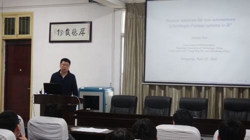 422下午3,在数学楼三楼学术报告厅,山东理工大学孙俊涛博士作了题为Positive solutions for non-autonomous schrodinger-poisson systems in 的学术报告。孙博士首先简单介绍了schrodinger-poisson系统的物理背景意义和变分结构,然后讲述了现有自治和非自治的schrodinger-poisson系统主要结果,最后建立新的变分结构和一些分析技巧等,获得了非自治的schrodinger-poisson系统正解的存在性和多解性,所得结果推广和改进了已有文献中的一些结果,且与之进行了比较。在报告过程中,孙博士还就如何发现问题及进一步可做的问题进行了深入的阐述,与会师生受益非浅。