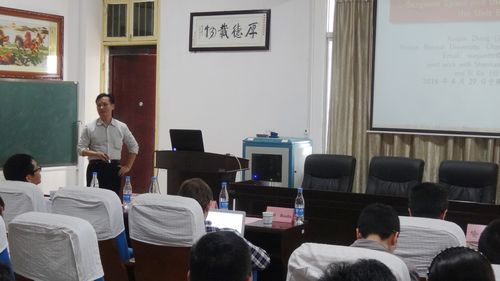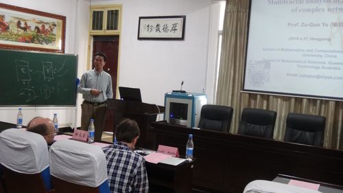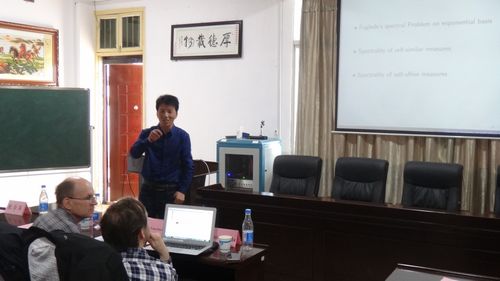 此次研讨会共安排了9个学术报告,分别是Antti Rasila博士作的题为“The Grötzsch Problem, Conformal Modulus and Applications”的报告,喻祖国教授作的题为“复杂网络上的多重分形分析”的报告,Matti Vuorinen教授作的题为“On hyperbolic type metrics and quasiconformal maps”的报告,王仙桃教授作的题为“Weak quasisymmetry of homeomorphisms and homogeneity and Alhfors regularity of metric spaces”的报告,刘竟成博士作的题为“Spectral property of self-affine measures on ”的报告,张学军教授作的题为“正规权Bergman 空间和Bloch空间上的紧复合算子”的报告,谢长春博士作的题为“Multiple Testing for Correlated Multiple outcomes in Clinical Trials”的报告,黄曼子教授作的题为“The QH invariance of natu-ral domains”的报告,刘刚博士作的题为“Symmetries of the Julia sets of Konig’s methods for polynomials”的报告。
