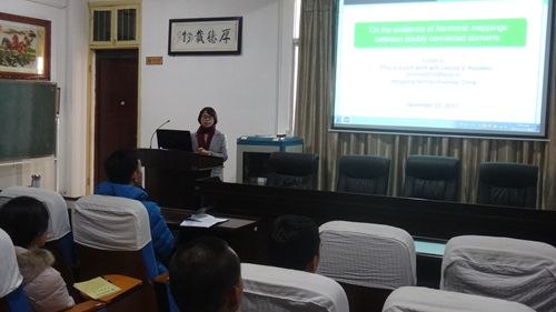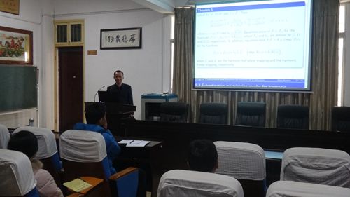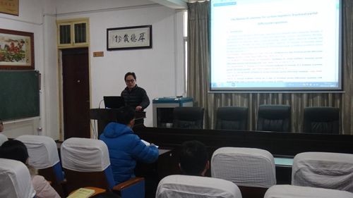11月22日下午,在数学楼学术报告厅,我校科技处处长罗李平教授作了题为“Oscillation of solutions for certain impulsive fractional partial differential equations ”的学术报告。然后,我院陈少林博士作了题为“Landau type theorems and Dirichlet type spaces of solutions to the @-equation”的学术报告。接着,我院周志东博士作了题为“Random hypergraphs and their applications”的学术报告。接着,我院刘刚博士作了题为“Harmonic pre-Schwarzian and its applications”的学术报告。接着,我院副院长李浏兰教授作了题为“Bohr's radius of some harmonic functions”的学术报告。最后,我院院长杨柳博士作了题为“分数微分方程解的存在性”的学术报告。