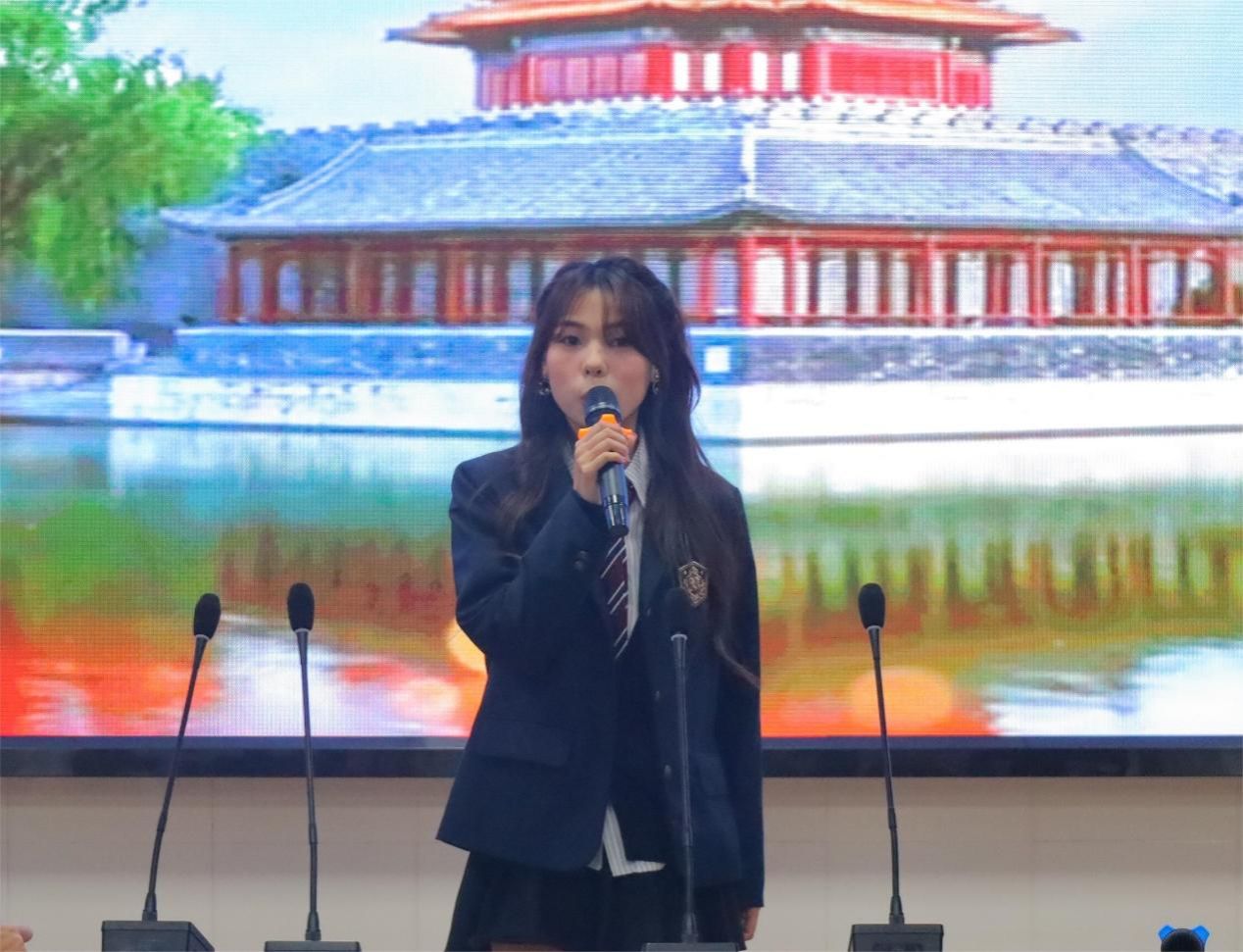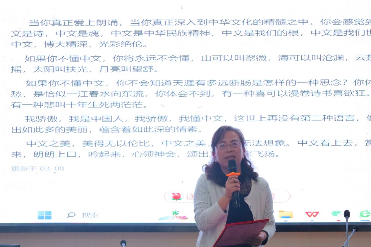 及至比赛尾声,我院党总支书记彭巧燕老师深情献诵《中文之美》,与在场的全体师生共同品味中文的独特魅力。在诵读过程中,彭书记展现了她深厚的语言功底和感染力。她时而慷慨激昂,将文字中的激情与力量传递至每一位听众;时而低沉悠扬,让每一个字、每一个词都仿佛拥有了生命和灵魂。