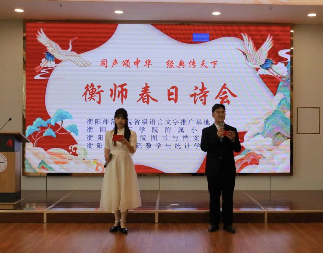 在观众热情高涨的氛围中,演出活动正式拉开了序幕。衡阳师范学院省级语言文字推广基地首席专家彭巧燕致辞,强调了语言文字在传承发展中华优秀传统文化中的重要作用,并对此次活动的深远意义进行了阐述。她表示,通过举办“同声颂中华,经典传天下”这样的活动,旨在让师生们更深入地理解和感受中华经典文化的魅力,增强文化自信,增长爱国情怀。接着,衡师音乐学院的同学们抚琴弄乐,为我们演奏《青玉案·元夕》,演绎贯穿古今的不朽传说;衡师文学院的同学们吟诵古韵,为我们朗诵《春天,遂想起》,描绘着和煦的春风贵客;斯洛伐克访问交流团的小朋友们以天真烂漫的童声朗诵了诗歌《小小的船》,为现场观众带来了童趣与生机;衡师美术学院的同学们低吟浅唱,用优美歌声为我们吟唱了《诗之歌·春》,让春意在现场流淌;衡师麻豆人妻少妇精品无码区的同学们神采奕奕,为我们带来《吟数学之美,诵数学之趣》,探寻着数与诗的奥秘。