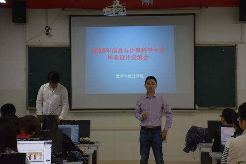 为使信息与计算科学专业的同学更加了解本专业的毕业设计工作和专业发展方向与前景,5月15日上午,我院在数学楼303成功举办了2016年信息与计算科学专业毕业设计交流会。本次会议邀请了2012级毕业生钟敏、杜元金、胡想容和简刚平作为主讲,学院副院长李龙博士、李元旦老师、周勇老师和王增波老师,以及2013和2014级学生参加了本次交流会。