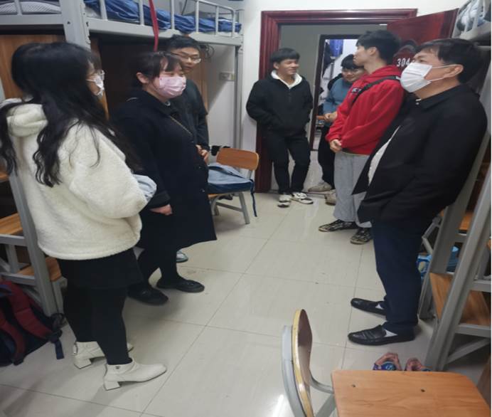 为了加强学院疫情防控工作,3月17日,我院迅速成立疫情防控工作领导小组和工作小组,党总支书记杨家骏担任领导小组组长、副书记谭全球担任领导小组副组长,辅导员周长恩、贺妮、谢炎伶担任工作小组组长,6名学生党员“年级长”担任工作小组组员。128名学生党员亮出党员身份,每天深入354间宿舍监督核查,担当疫情防控责任。每位学生党员分管2-3间宿舍,每天晚上22:00后深入宿舍进行检查,记录分管宿舍人员晚归、健康码、行程码及体温等情况。核查完毕之后每位党员再报告给各自的“年级长”,年级长对分管党员的核查信息进行汇总并报给辅导员。在疫情防控常态化背景下,形成了领导小组统筹协调、工作小组齐抓共管、年级长紧密对接、宿舍长各司其职、全院学生全力配合的全员、全过程、全方位网格化疫情防控工作模式,做到疫情安全隐患早发现、早报告、早处置。