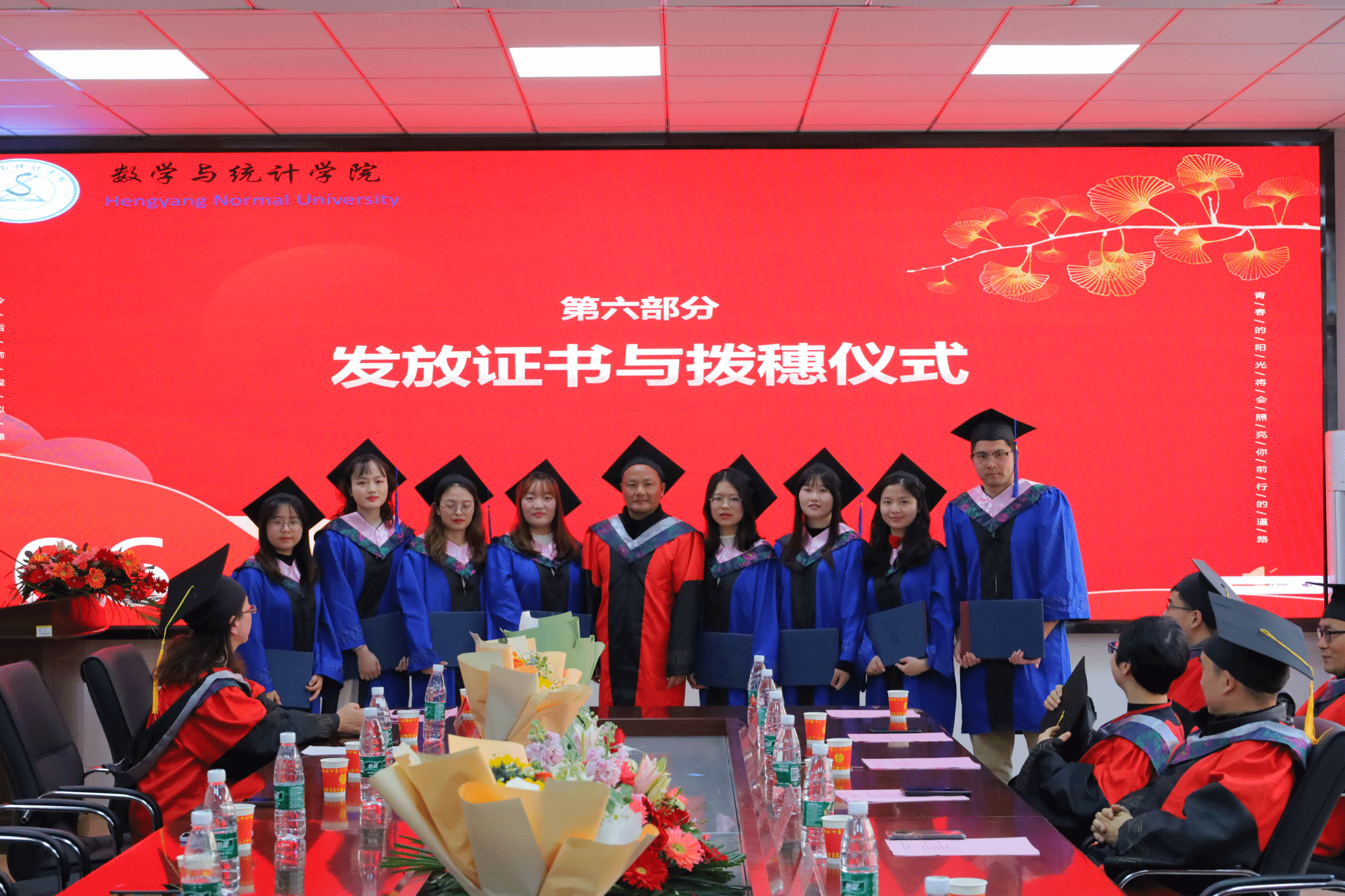 拨穗象征着成熟,代表着毕业生们硕果累累、学业有成。学位授予仪式上,分管研究生工作副院长李浏兰宣读学位授予名单,聂东明副校长为毕业研究生扶拨流苏并颁发毕业证书与学位证书,最后合影留念。