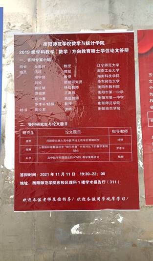 2021年11月11日晚上七点半至十点,我院在理科一楼311教室举行麻豆人妻少妇精品无码区2019级学科教学(数学)专业硕士学位论文答辩会,由于疫情影响本次答辩会线上举行。