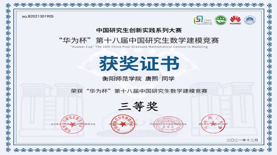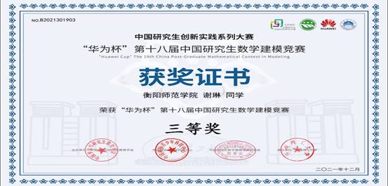 2021年,在院领导的关怀下,在各位指导老师的指导下,我院研究生在各类竞赛中再创佳绩,共获得各类奖励5项,其中: 谢琳、唐熙等同学在李龙老师、周勇老师的指导下获得“华为杯”数学建模竞赛国家三等奖两项; 吴斯同学在周立君老师、杨柳院长的指导下获得“田家炳”杯全日制教育硕士研究生师范技能竞赛国家三等奖一项; 王朝霞、方敏等同学在周立君老师的指导下获得湖南省研究生数学建模竞赛省二等奖一项,刘波,佘旷怡等同学在杨柳院长的指导下获得湖南省研究数学建模竞赛省三等奖一项。 部分获奖证书