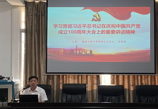 9月15日下午4:30,我院全体教职工在理科1楼三楼会议室集中学习习近平总书记在庆祝中国共产党成立100周年大会上的重要讲话精神。党总支书记杨家骏主持学习会议并作宣讲报告。